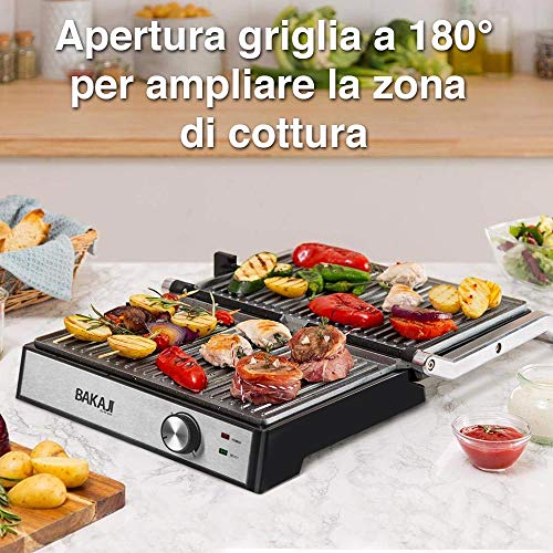 Maar wat de nieuwe elektrische Bakaji grillpan echt uniek maakt, is de mogelijkheid om de grill tot 180 ° te openen. Hierdoor kun je de kookzone verdubbelen om meer levensmiddelen tegelijk te koken.