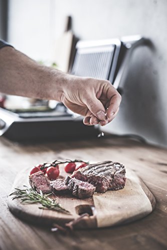 5-traps temperatuurinstelling voor aanpassing aan het type en de dikte van het voedsel 30 minuten. Timer met automatische uitschakelfunctie en akoestisch signaal. Contactgrilloppervlak: ca. 750 cm² (25 x 30 cm)