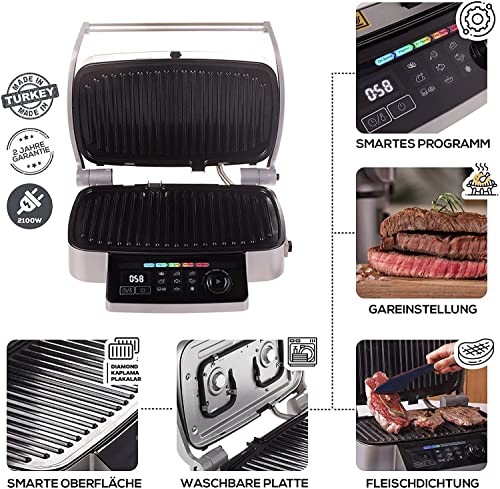 Karaca Griller sandwichtbroodrooster met 9 functies voor gehaktballen, lamkoteletten, vlees, kip, vis, groenten, hamburgers/toast, salami en worst en smeltend ijs. Het verlichte controlesysteem geeft het gaarniveau aan en maakt het de gebruiker mogelijk om het kookproces gemakkelijk te volgen
